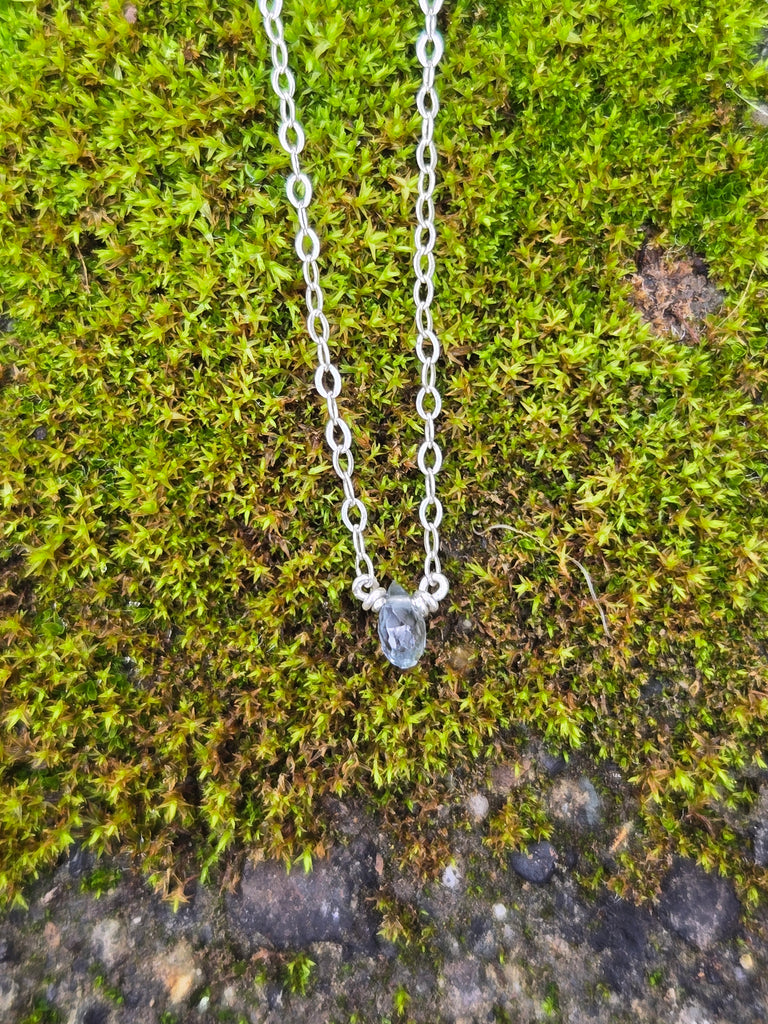 The Montana Sapphire Faceted Dainty Briolette Sterling Silver Necklace features an all natural American gemstone. They're from Montana and are known for their pristine clear denim blue color. They come in other colors as well, but the most coveted amd common color found is blue. I had never seen Montana Sapphires in bead form until I found these. I bought 3 strands of them and am so excited to offer them as an affordable necklace option.